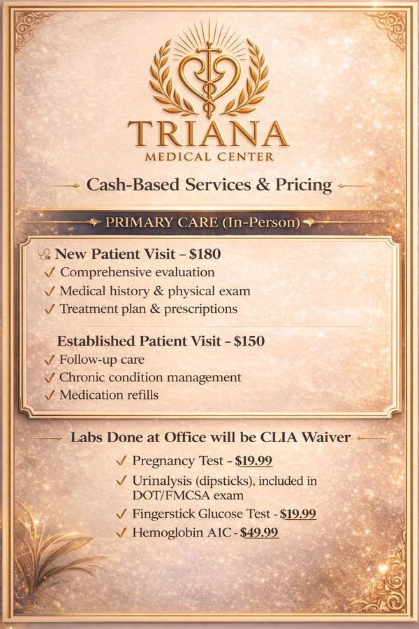 At Triana Medical Center, we provide comprehensive, compassionate care for both chronic and acute medical conditions, always placing the patient at the center of everything we do. We understand that many patients come to us after difficult or disappointing experiences elsewhere, and we take pride in restoring trust through listening, respect, and personalized medical care.