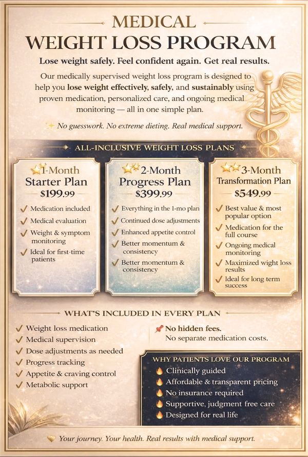 At Triana Medical Center, we believe weight loss should feel supported, empowering, and sustainable — never overwhelming. Our personalized medical weight-loss program is designed to make your journey pleasant, structured, and stress-free, with a strong focus on preventing rebound weight gain.